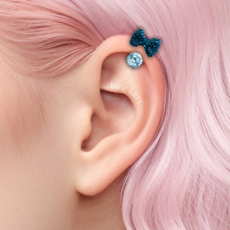 Inspired by Minnie, this earring features a 6mm round diamond with pavé bow design in lightweight F136 titanium. Perfect for helix and lobe piercings, the sparkling zirconia adds playful charm to everyday outfits, blending cuteness with versatile style.